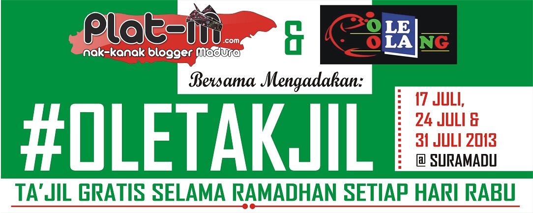 Plat-M bekerjasama dengan Ole Olang Resto?akan bagi-bagi ta'jil di Jembatan Suramadu (arah ke Madura) yang akan diadakan setiap hari Rabu. Mulai tanggal 17 Juli dilanjut tanggal 24 dan 31 Juli 2013. Bagi yang mau berbagi membawa ta'jil dari rumah atau hanya sekadar bergabung bersama kami juga boleh. Ditunggu aksinya besok Rabu ya teman!